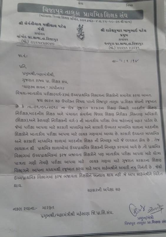 KHATAKIY PARIXA AAPVA MA UCHCH PRIMARY SCHOOL NA SHIXAKO NO SAMAVESH KARVA BABAT VIJAPUR SANGH NO LETTER VANCHVA LAYAK.
